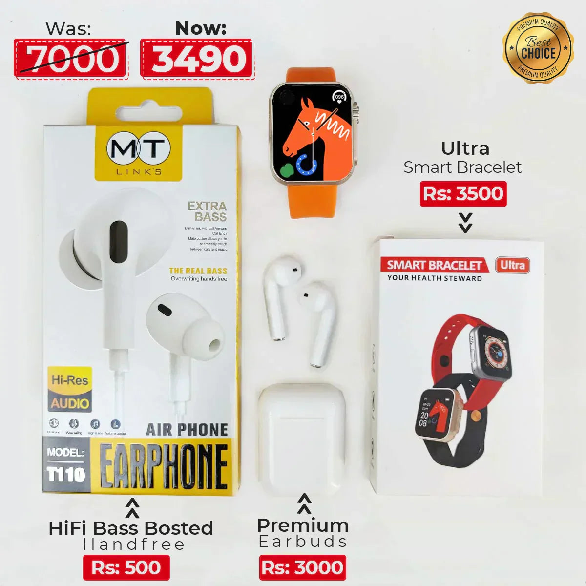 Get everything you need to stay connected and entertained with the S8 Ultra Watch + Earbuds + Handsfree All-in-One Combo. This incredible package includes the latest smartwatch technology, wireless earbuds, and a handsfree headset, all for one unbeatable price.